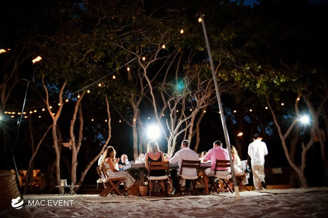 The string lights add warmth and romance to weddings, parties, and corporate events in San Pancho. Perfect for beach receptions, garden dinners, or outdoor lounges, this event lighting rental creates a soft, inviting glow that enhances your event’s ambiance. Whether draped above dining areas or woven through trees and structures, string lights bring charm and elegance to any setting. Renting string lights in San Pancho ensures professional installation and a cohesive look that complements your décor. For a magical and timeless atmosphere that guests will love, string lights are a beautiful choice for any celebration.